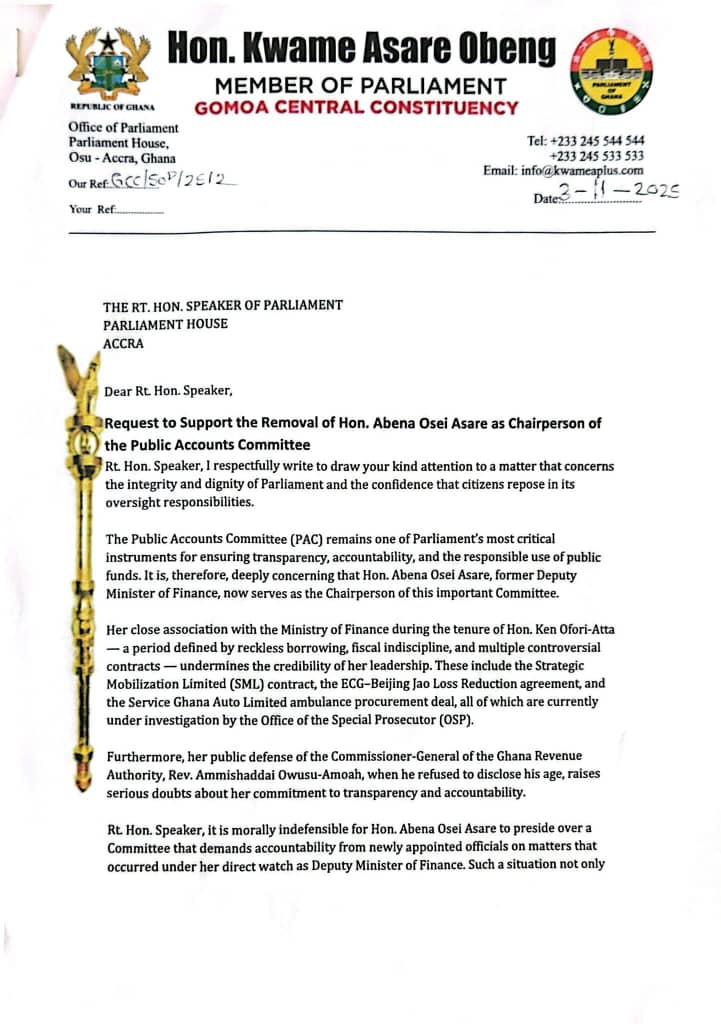 Member of Parliament for Gomoa Central, Kwame Asare Obeng, popularly known as A Plus, has petitioned the Speaker of Parliament to remove Abena Osei-Asare as Chairperson of the Public Accounts Committee (PAC).