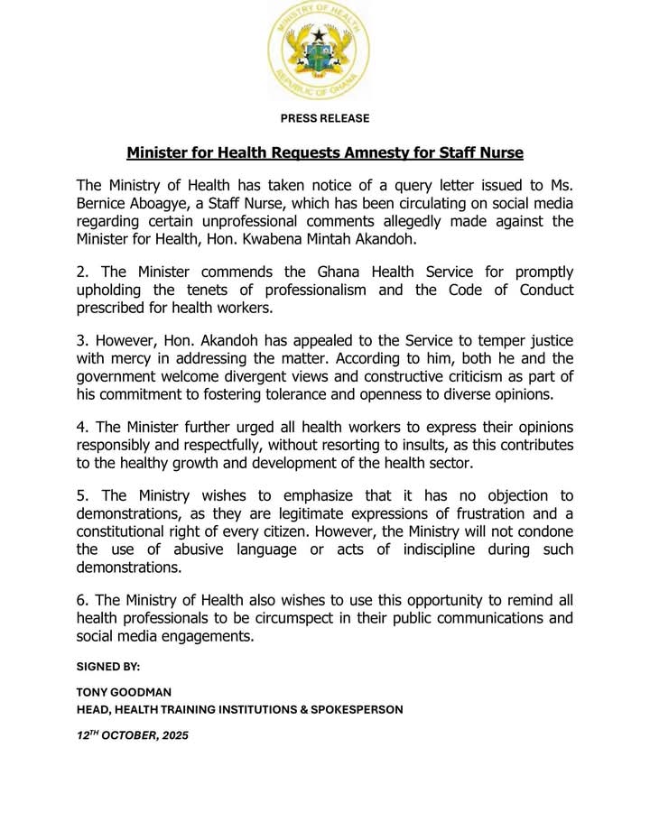 In a statement issued on October 12, 2025, and signed by Ministry Spokesperson Tony Goodman, the Minister acknowledged the GHS’s swift action but urged the Service to “temper justice with mercy” in handling the matter involving Ms. Bernice Aboagye, a staff nurse at the Nkenkaasu District Hospital.