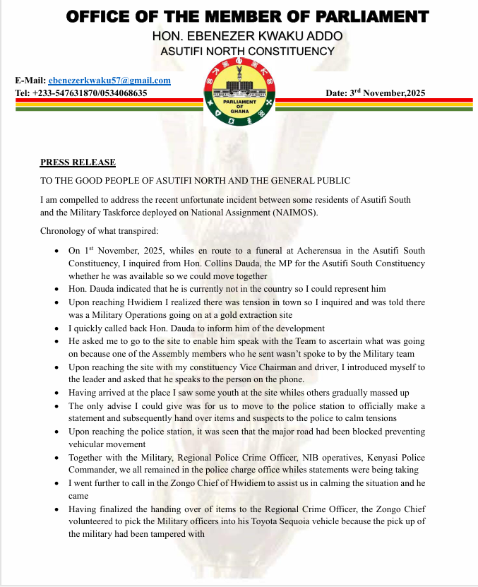 In a statement on Monday, November 3, 2025, the MP described the incident as unfortunate and clarified that he only intervened to help calm tensions between the taskforce and some residents of Asutifi South.