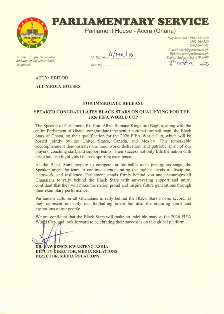 In a statement issued by the Parliamentary Service, Mr. Bagbin praised the team’s determination, unity, and fighting spirit, describing their qualification as a proud moment that rekindles national pride and showcases Ghana’s enduring football legacy.