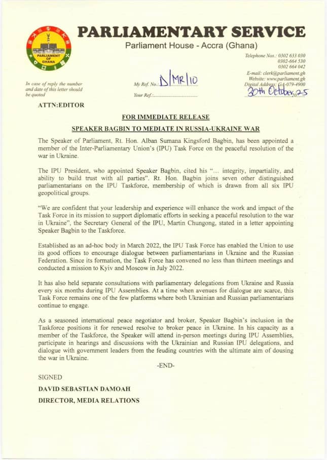 The Parliamentary Service of Ghana described the appointment as a recognition of Bagbin’s longstanding role in peace-building and parliamentary diplomacy across Africa and beyond.
