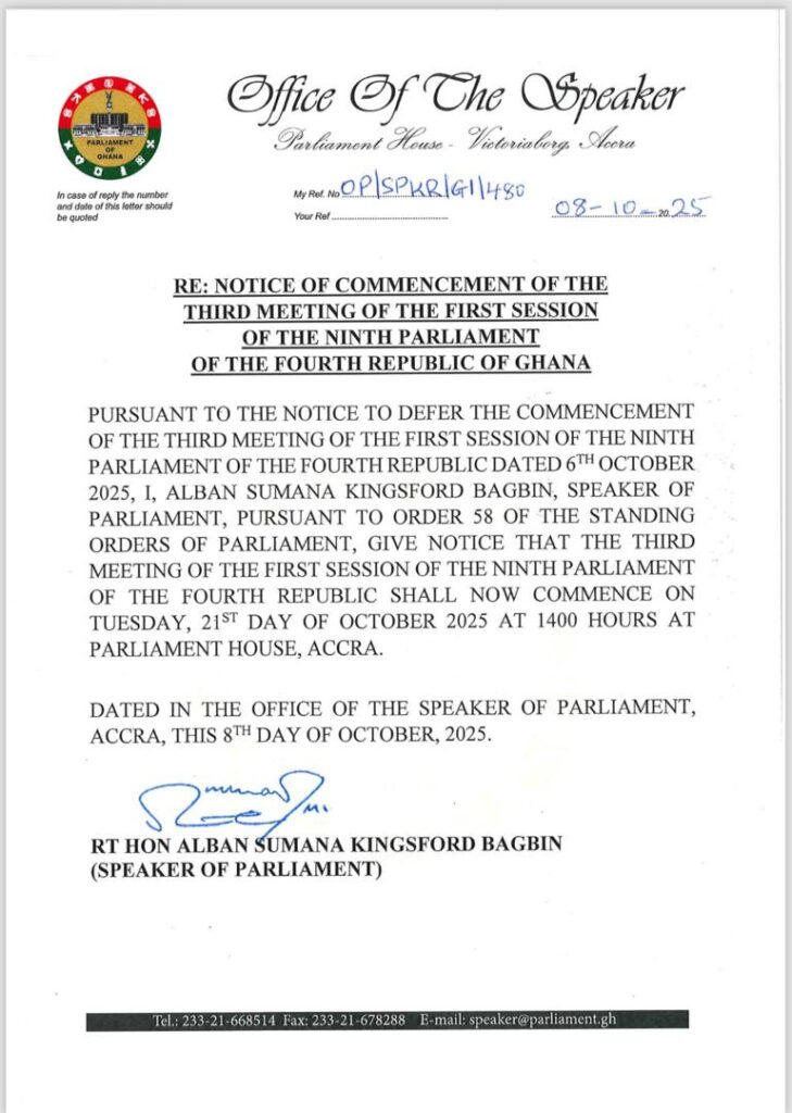 In a formal notice issued from his office on Wednesday, October 8, 2025*, the Speaker stated that the Third Meeting will now commence on Tuesday, October 21, 2025, at 2:00 p.m. in Parliament House, Accra.