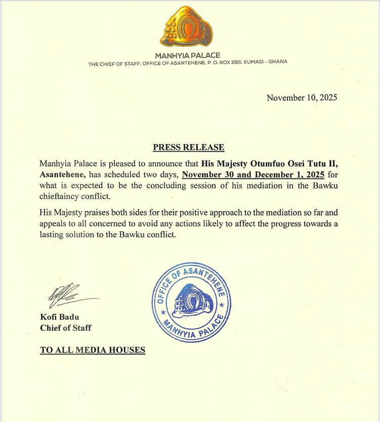 The Asantehene, Otumfuo Osei Tutu II, will hold the final phase of mediation talks on the long-standing Bawku chieftaincy conflict on November 30 and December 1, 2025, the Manhyia Palace has announced.