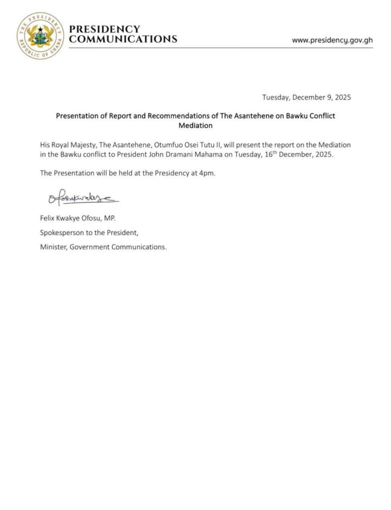 President John Dramani Mahama is set to formally receive the Bawku Mediation Report on Tuesday December 16, 2025, at the Jubilee House, marking a critical step in efforts to resolve the protracted conflict in Bawku.