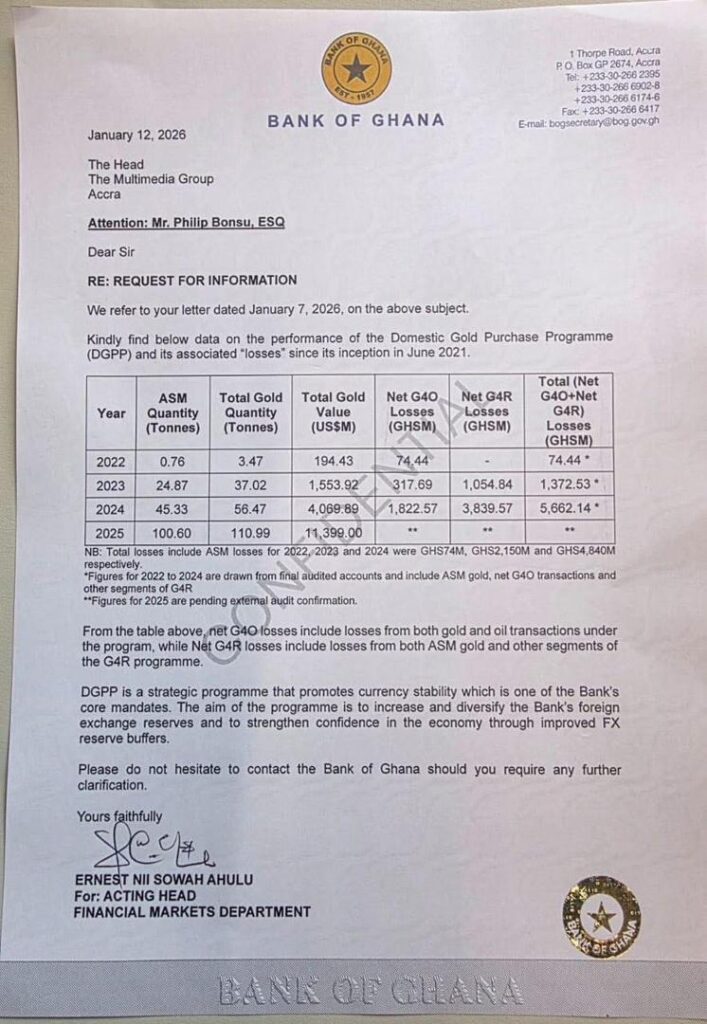 The Bank of Ghana (BoG) has formally responded to a Right to Information (RTI) request from The Multimedia Group, providing data on the performance and financial outcomes of the Domestic Gold Purchase Programme (DGPP), also known as the Gold-for-Reserve (G4R) initiative, since its inception in June 2021.