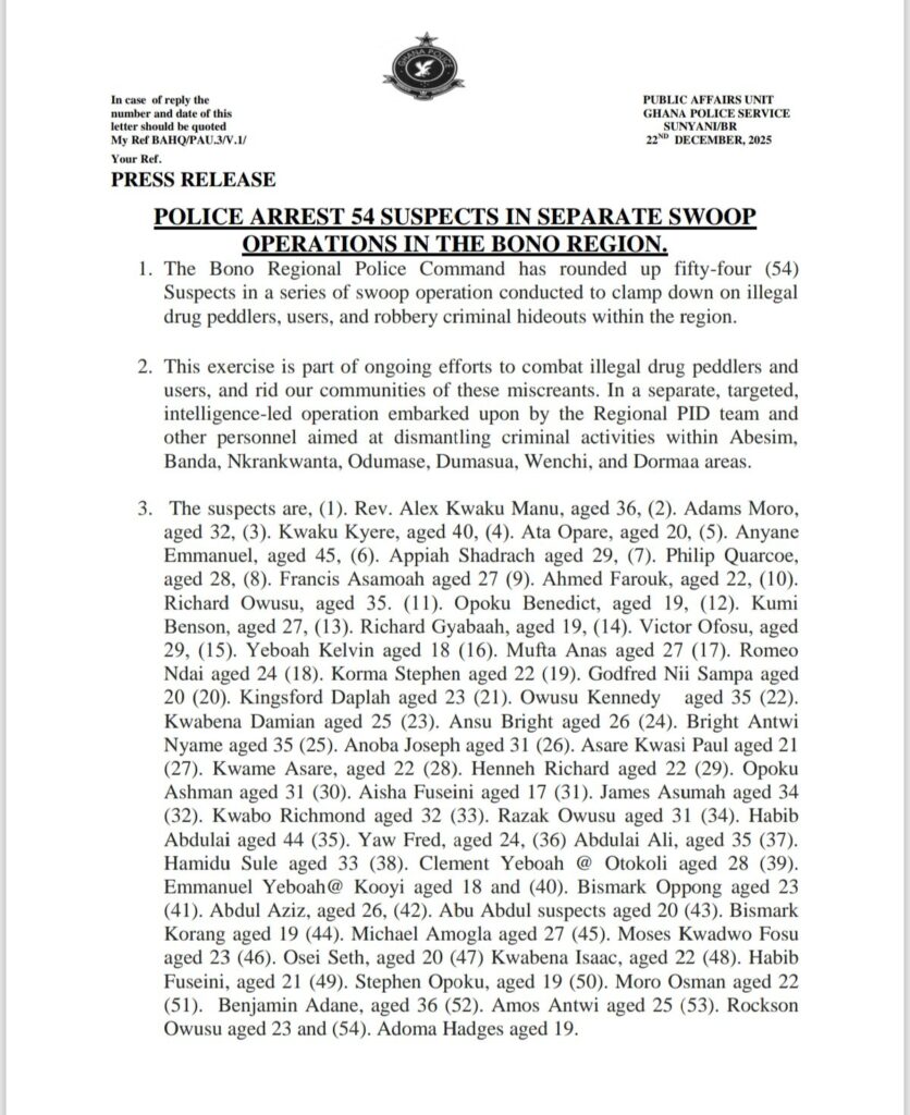 Bono Region: Police arrest 54 suspects in anti-crime operations