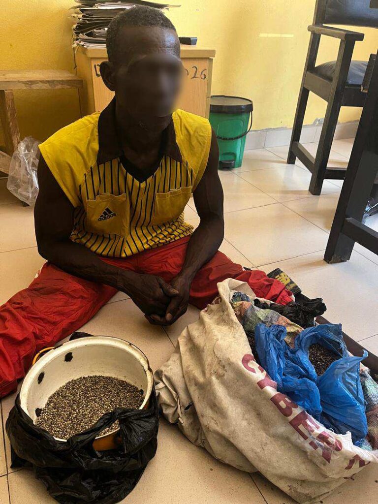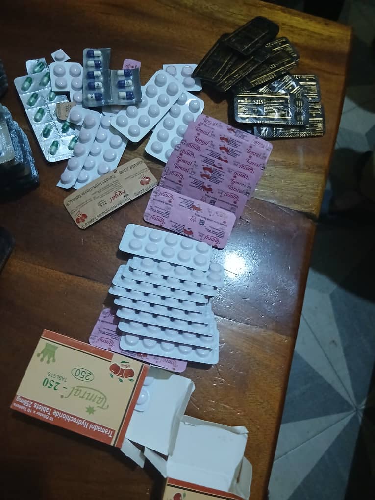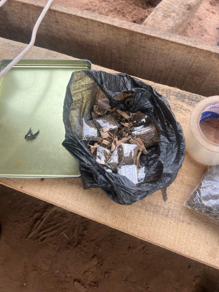 The police also recovered various substances and items, including tramadol, dried leaves and seeds suspected to be Indian hemp, a small crusher, six pairs of scissors, a green tricycle, matches, and cigarettes, which have been retained as evidence.