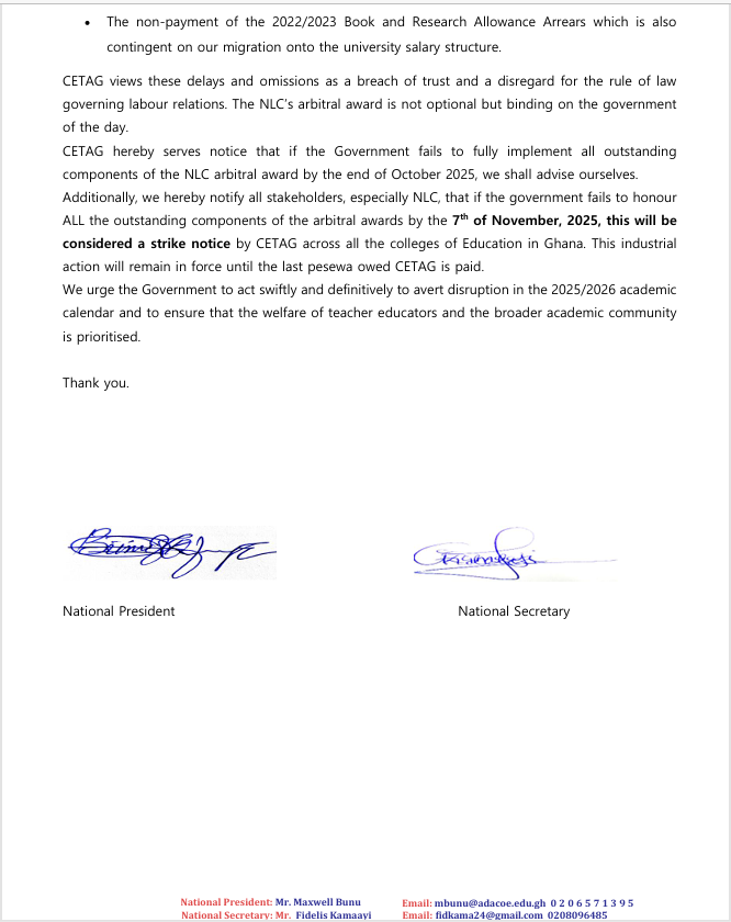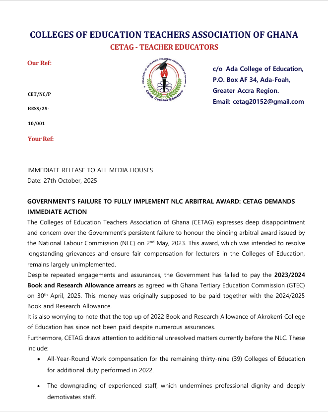 The Colleges of Education Teachers Association of Ghana (CETAG) has warned the government to fully implement the National Labour Commission’s (NLC) arbitral award by November 7, 2025, or face a nationwide strike across all 46 Colleges of Education.