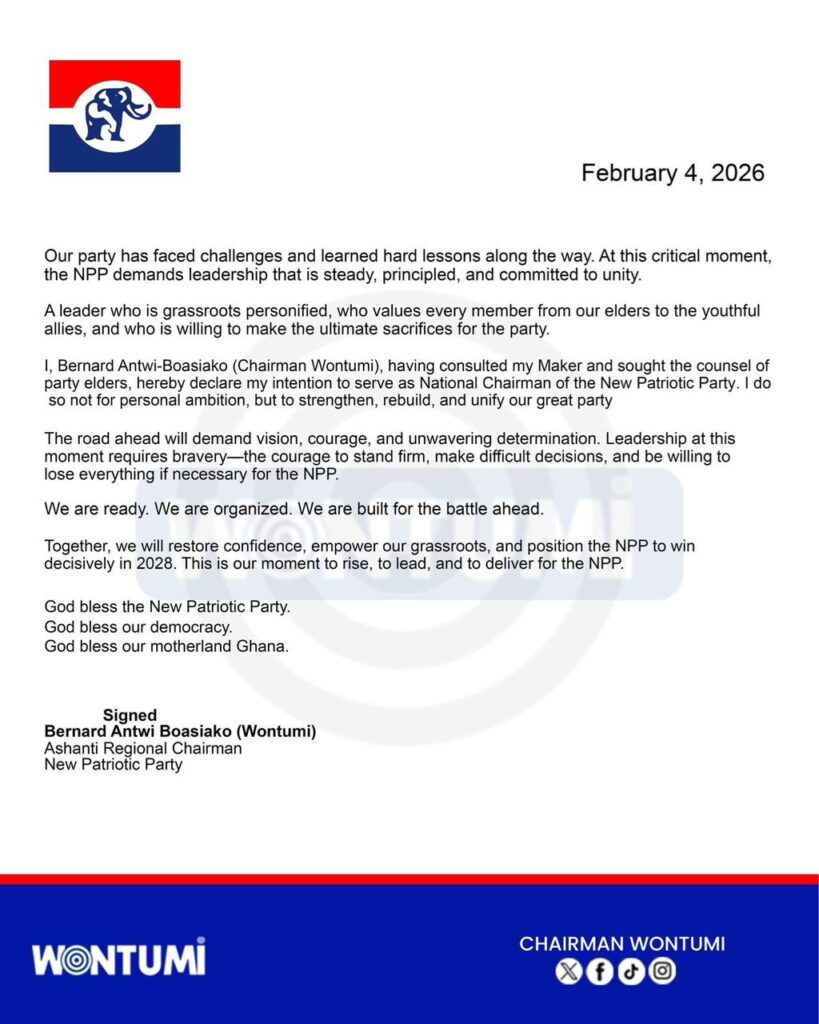 In a statement released on Wednesday, February 4, 2026, Wontumi emphasized that his bid is driven not by personal ambition, but by a commitment to “strengthen, rebuild, and unify” the party after recent challenges.