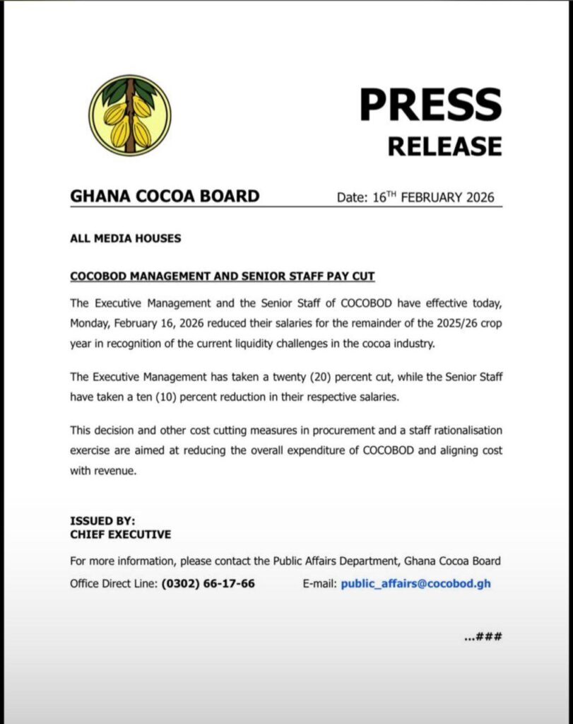 Executive Management and Senior Staff of the Ghana Cocoa Board (COCOBOD) have announced salary reductions for the remainder of the 2025/26 crop year as part of efforts to respond to the cocoa sector’s current liquidity challenges.