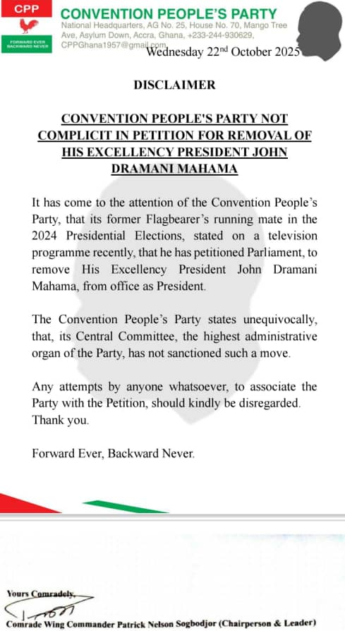 “It has come to the attention of the Convention People’s Party, that its former Flagbearer’s running mate in the 2024 Presidential Elections, stated on a television programme recently, that he has petitioned Parliament, to remove His Excellency President John Dramani Mahama, from office as President,” the statement read.