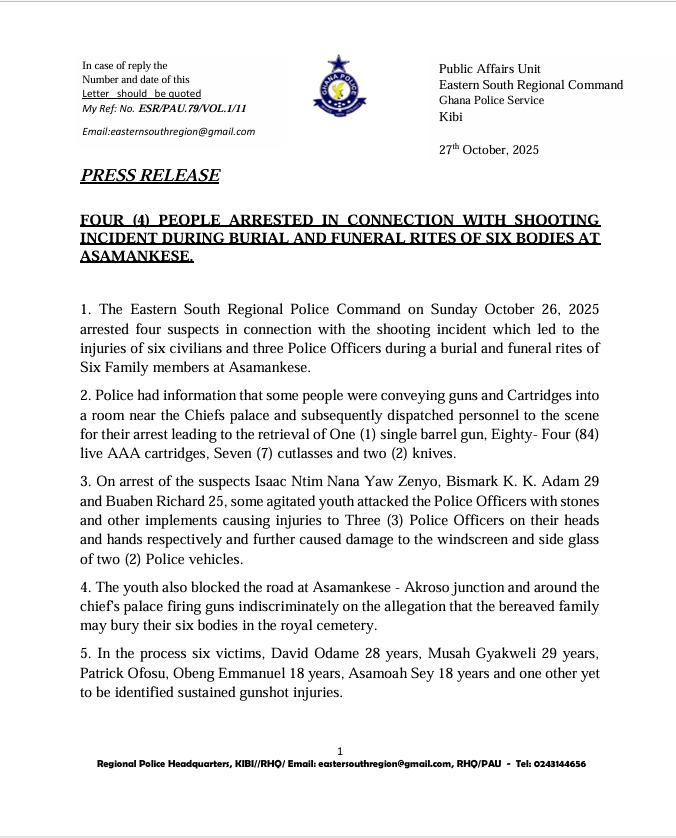 The Eastern South Regional Police Command has arrested four individuals in connection with violent clashes that erupted during a burial ceremony in Asamankese on Sunday, October 26.