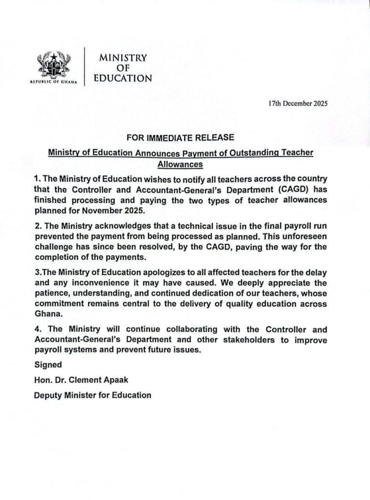 In a statement dated Wednesday, December 17, 2025, the Ministry explained that the Controller and Accountant-General’s Department (CAGD) completed the processing and payment of two types of allowances for teachers. The delay was attributed to a technical problem during the final payroll run, which has now been resolved.