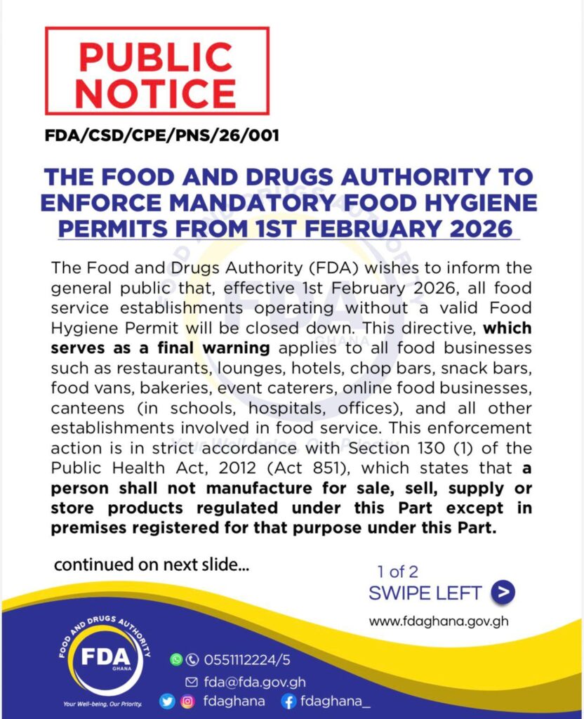 “The Food and Drugs Authority wishes to inform the general public that, effective 1st February 2026, all food service establishments operating without a valid Food Hygiene Permit will be closed down.”