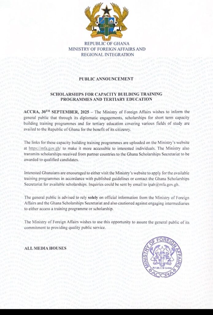 In a public notice issued on Tuesday, September 30, 2025, the Ministry stated, “Through its diplomatic engagements, scholarships for short term capacity building training programmes and for tertiary education covering various fields of study are availed to the Republic of Ghana for the benefit of its citizenry.”