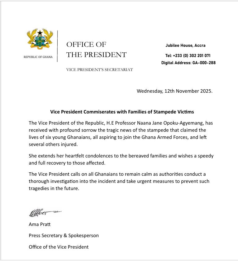 In a statement, she said, “The Vice President of the Republic, H.E Professor Naana Jane Opoku-Agyemang, has received with profound sorrow the tragic news of the stampede that claimed the lives of six young Ghanaians, all aspiring to join the Ghana Armed Forces, and left several others injured.”