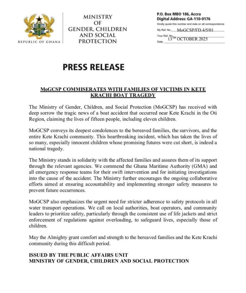 In a statement on October 13, 2025, the ministry extended heartfelt condolences to the families of the victims, survivors, and the broader Kete Krachi community, describing the incident as a national tragedy.
