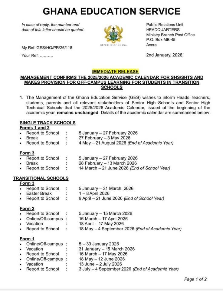 The Ghana Education Service (GES) has announced structured online and off-campus learning periods for students in transitional Senior High Schools and Senior High Technical Schools as part of the 2025/2026 academic year.