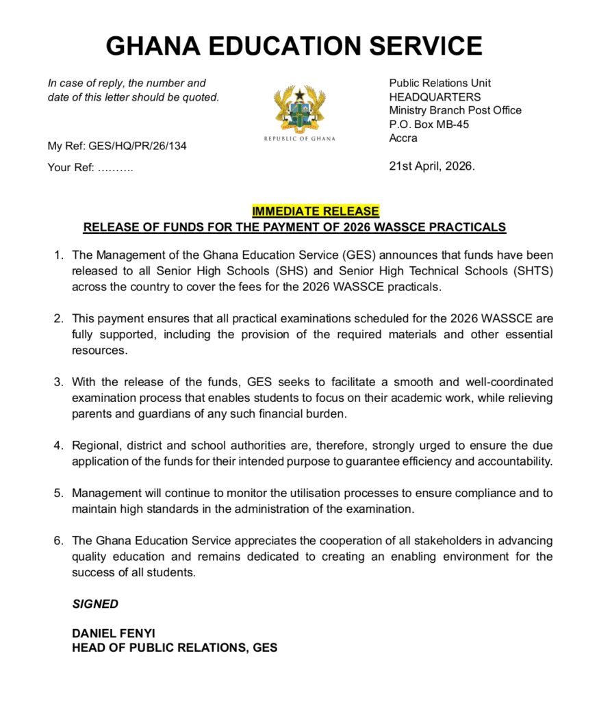 Ghana Education Service has released funds to support the conduct of the 2026 West African Senior School Certificate Examination (WASSCE) practicals across all Senior High Schools (SHS) and Senior High Technical Schools (SHTS) in the country.