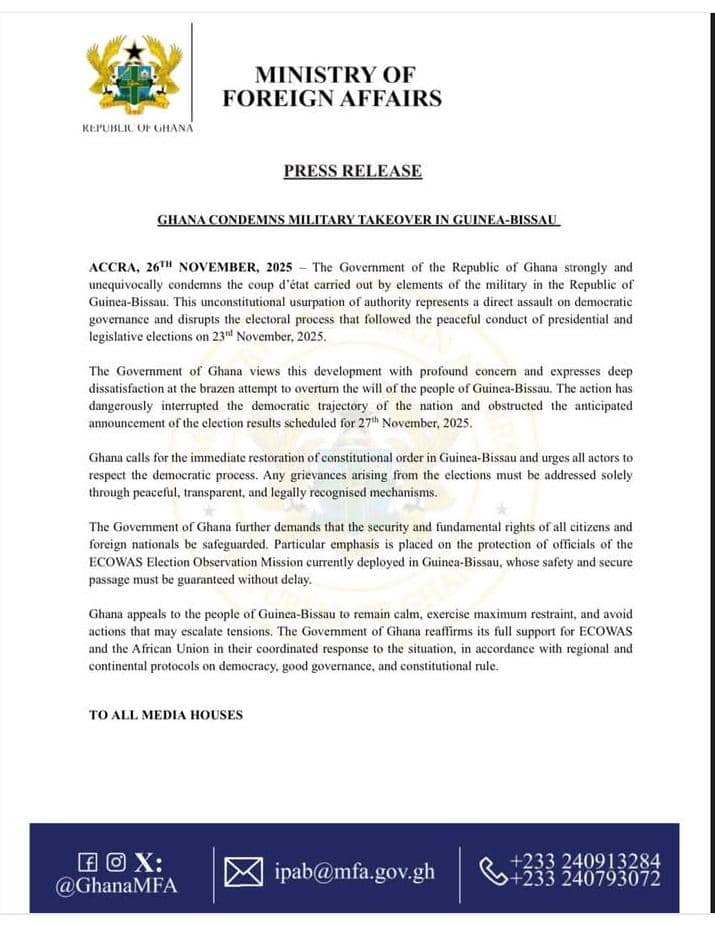 Ghana has joined a mounting chorus of regional and international condemnation after the military in Guinea‑Bissau declared control of the country, suspended the just‑completed elections, and arrested the president.