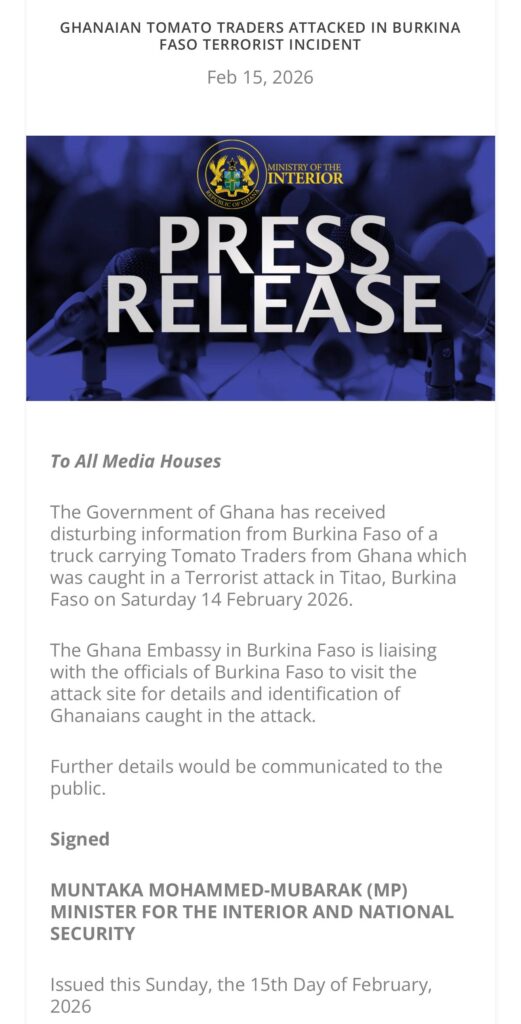Government has confirmed that a truck carrying Ghanaian tomato traders was caught in a terrorist attack in Titao, northern Burkina Faso, on Saturday, February 14.