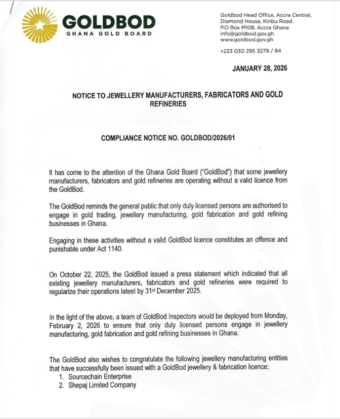 Illegal gold and jewellery operators are in trouble as the Ghana Gold Board (GoldBod) plans to deploy inspectors nationwide from Monday, February 2, 2026, to clamp down on unlicensed activities in the sector.
