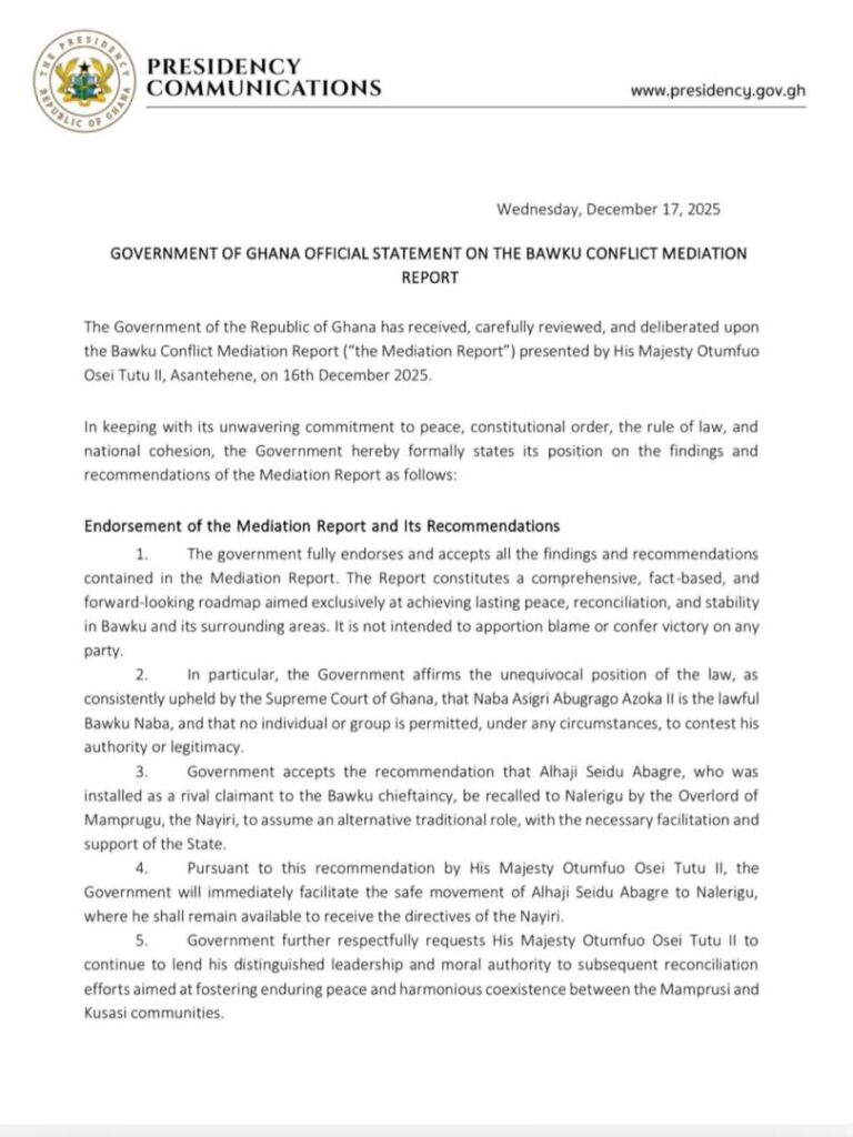 The announcement was contained in a statement issued on Wednesday, December 17, 2025, after Cabinet formally endorsed the Bawku Conflict Mediation Report presented by Otumfuo Osei Tutu II.