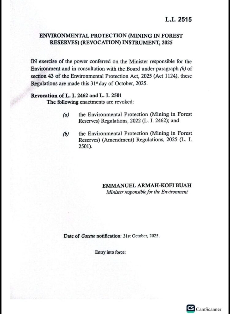 The repeal was effected through the Environmental Protection (Mining in Forest Reserves) Revocation Instrument, 2025, which became law on Wednesday, December 10, 2025, following its submission to Parliament by the Minister for Lands and Natural Resources, Emmanuel Armah-Kofi Buah, who is also the Acting Minister for Environment.
