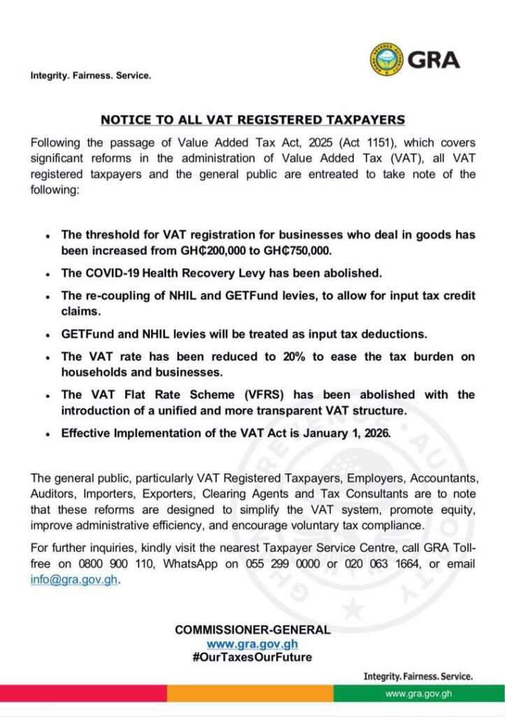 The Ghana Revenue Authority (GRA) has announced sweeping reforms to the Value Added Tax (VAT) regime, set to take effect from January 1, 2026, following the passage of the Value Added Tax Act, 2025 (Act 1151).