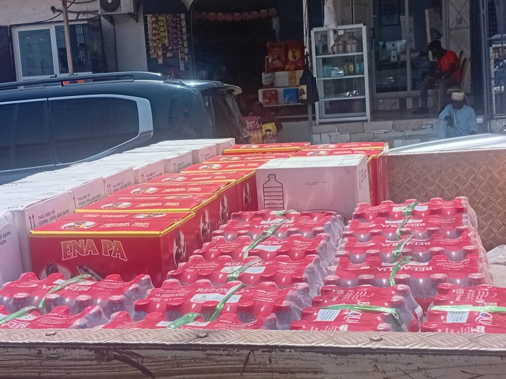 The items presented included 100 bags of rice, 20 cartons of cooking oil, 20 cartons of mackerel, 30 cartons of bottled water, and a cash donation of GH¢20,000.