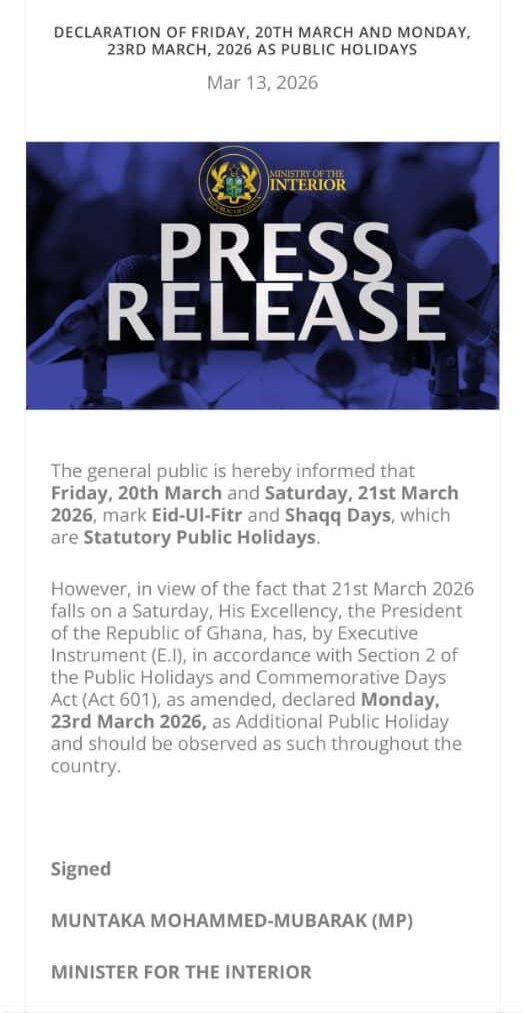In a statement signed by the Minister for the Interior, Muntaka Mohammed-Mubarak, the ministry said the holidays are to mark Eid-Ul-Fitr, which falls on Friday, March 20, and Shaqq Day, observed on Saturday, March 21, 2026.