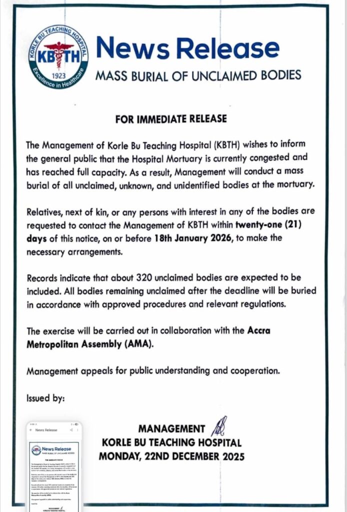 According to the hospital, any bodies that remain unclaimed after the deadline will be buried through a coordinated process with the Accra Metropolitan Assembly (AMA), in line with approved public health and administrative procedures.