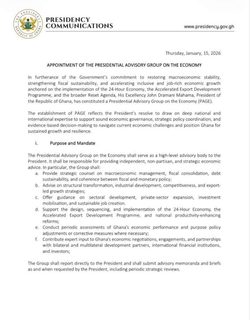President John Dramani Mahama has constituted a high-level Presidential Advisory Group on the Economy (PAGE) to provide independent and strategic guidance on Ghana’s economic recovery agenda.