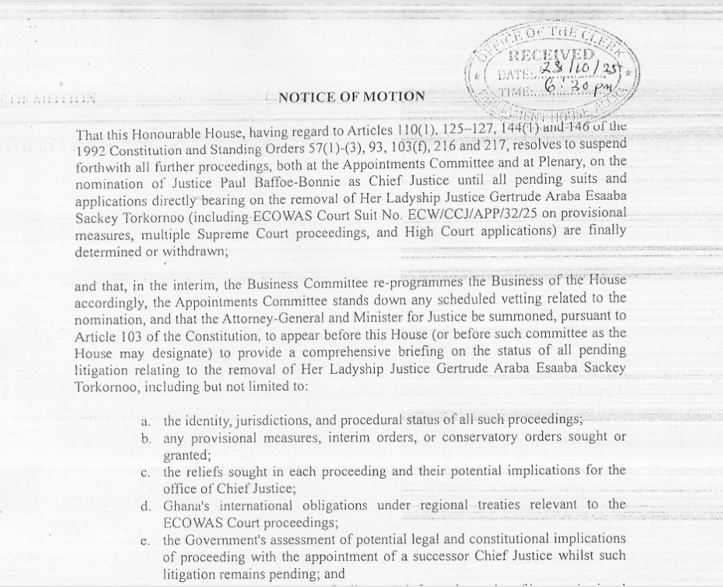 The motion, officially lodged with the Clerk to Parliament, calls for an immediate freeze on activities by both the Appointments Committee and the plenary regarding Justice Baffoe-Bonnie’s vetting and approval.