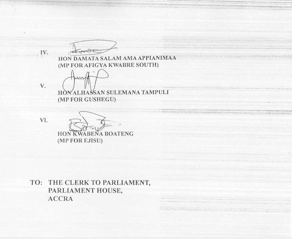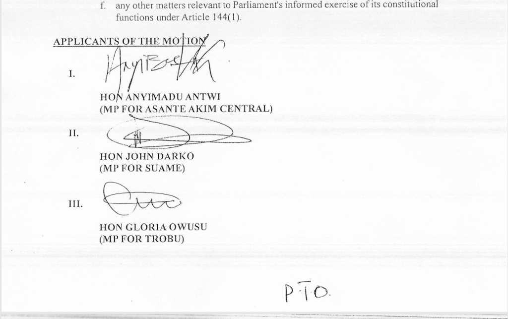 The motion was tabled by three MPs — Anyimadu Antwi (Asante Akim Central), John Darko (Suame), and Gloria Owusu (Trobu) — with support from Damatta Salam Ama Appianimaa (Afigya Kwabre South), Alhassan Sulemana Tampuli (Gushegu), and Kwabena Boateng (Ejisu).