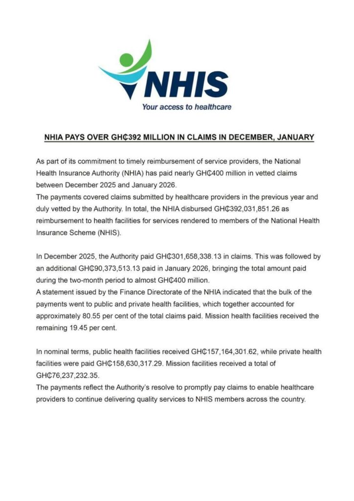 The National Health Insurance Authority (NHIA) has paid a total of GH₵392 million in claims to healthcare providers for services rendered in December 2025 and January 2026.