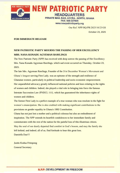 The New Patriotic Party (NPP) has expressed deep sorrow over the passing of former First Lady, Nana Konadu Agyeman-Rawlings, who died on October 23, 2025, at the Ridge Hospital in Accra.