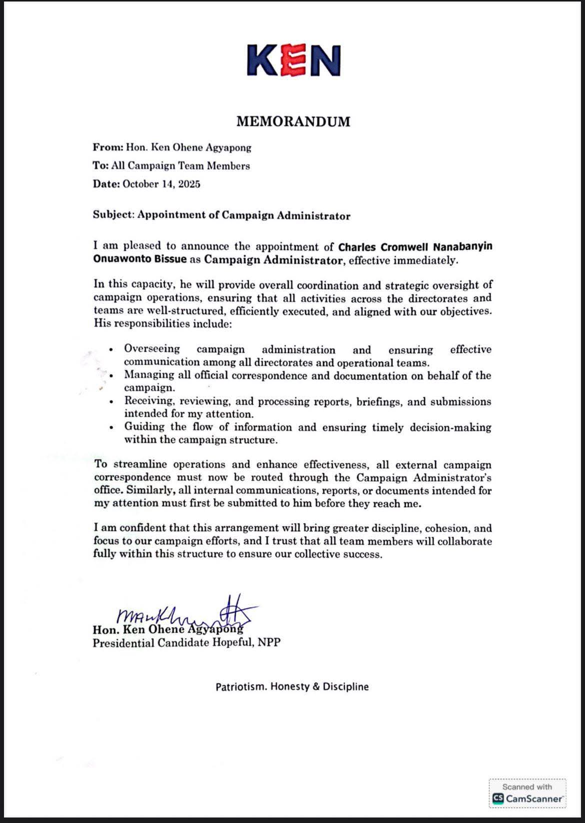 In a memo to his campaign team dated October 14, 2025, Mr. Agyapong said the appointment takes immediate effect and is aimed at ensuring greater discipline, coordination, and focus within the campaign.