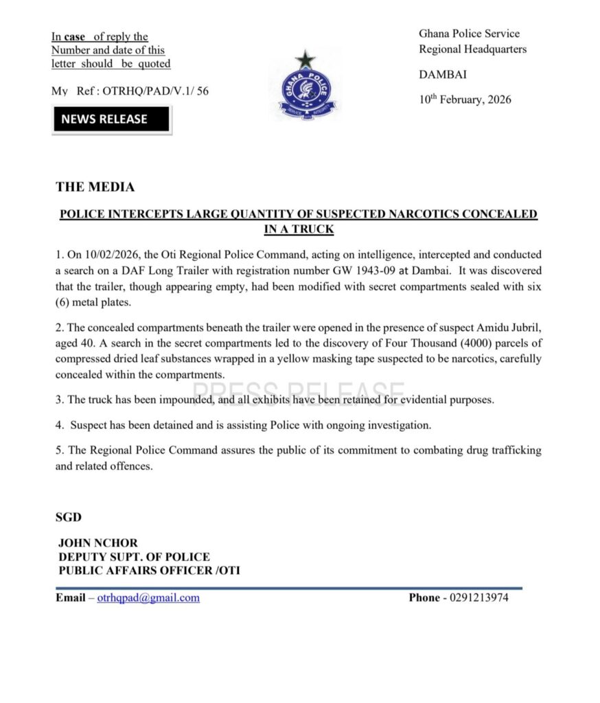 Over 4,000 parcels of suspected narcotics were intercepted following a targeted operation by the Oti Regional Police Command in Dambai on February 10, 2026.