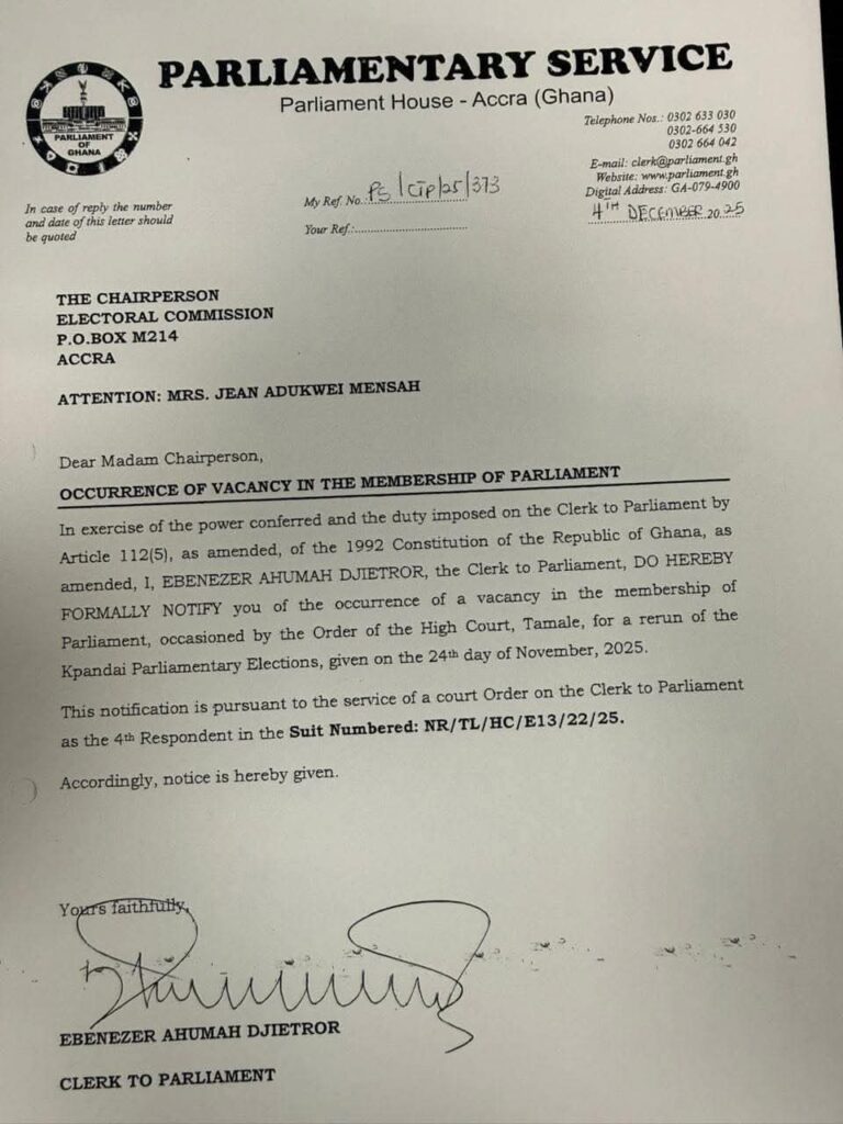 In a letter dated December 4, 2025, the Clerk to Parliament, Ebenezer Ahumah Djietror, wrote to EC Chairperson Jean Adukwie Mensah, stating that the vacancy arose from a High Court decision ordering a rerun of the 2024 parliamentary election in the constituency.