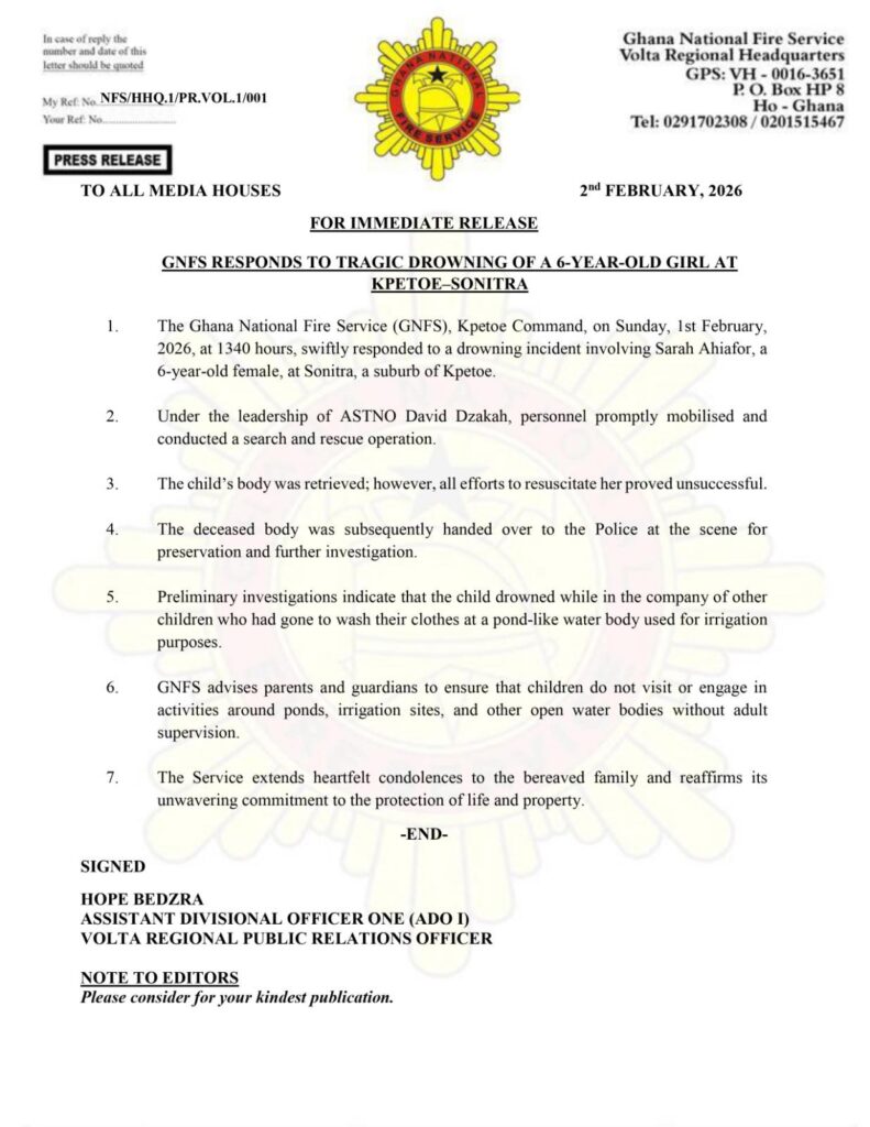 A tragic accident in the Volta Region claimed the life of a six-year-old girl on Sunday, February 1, 2026, after she drowned in an irrigation pond at Sonitra, a suburb of Kpetoe.
