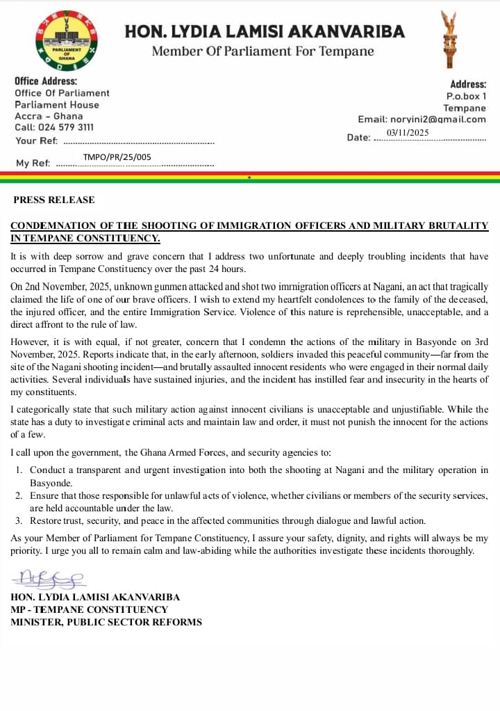 Member of Parliament for Tempane, Lydia Lamisi Akanvariba, has called for an independent and transparent investigation into two violent incidents that have rocked her constituency — the killing of an immigration officer and an alleged military assault on civilians.