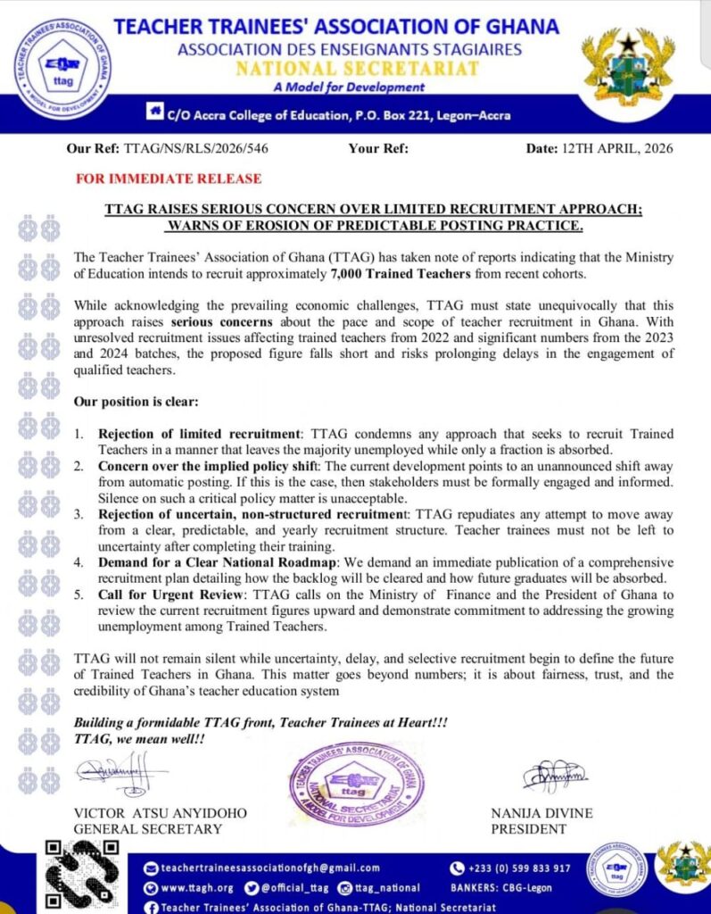 The association stated: “The Teacher Trainees’ Association of Ghana (TTAG) has taken note of reports indicating that the Ministry of Education intends to recruit approximately 7,000 Trained Teachers from recent cohorts.”