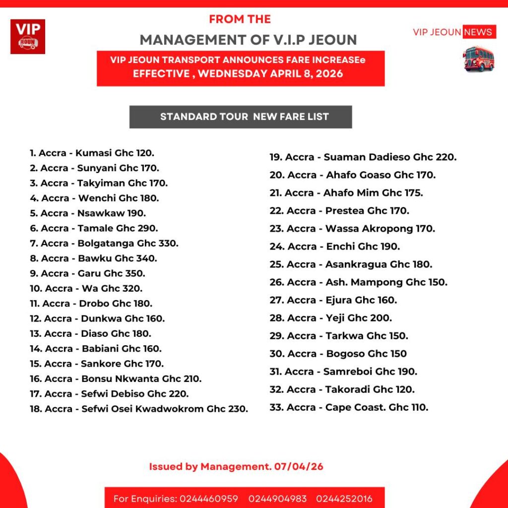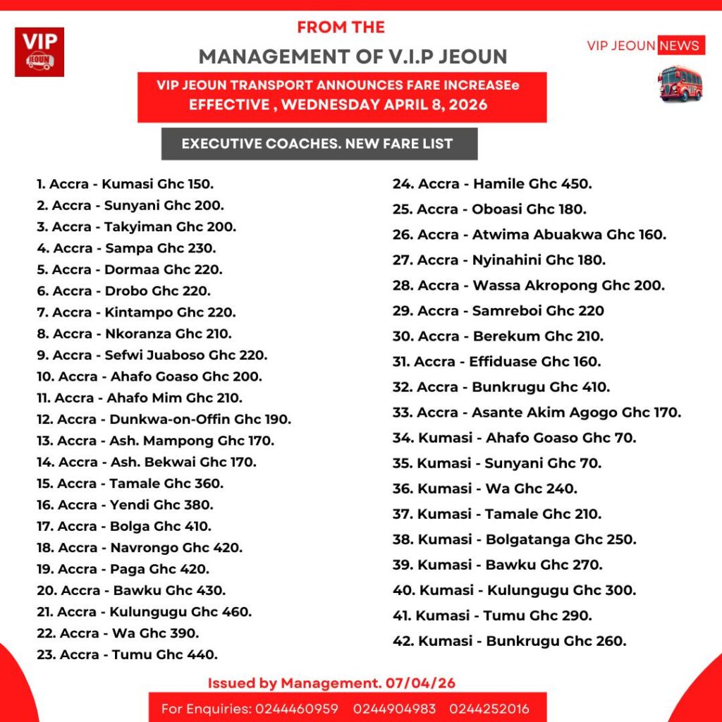 Executive coach passengers will pay higher fares, with the Accra–Kumasi route now priced at GHS 150, Sunyani at GHS 200, and Tamale at GHS 360. Additional long-distance routes, including Navrongo and Bawku, have also been revised upward.