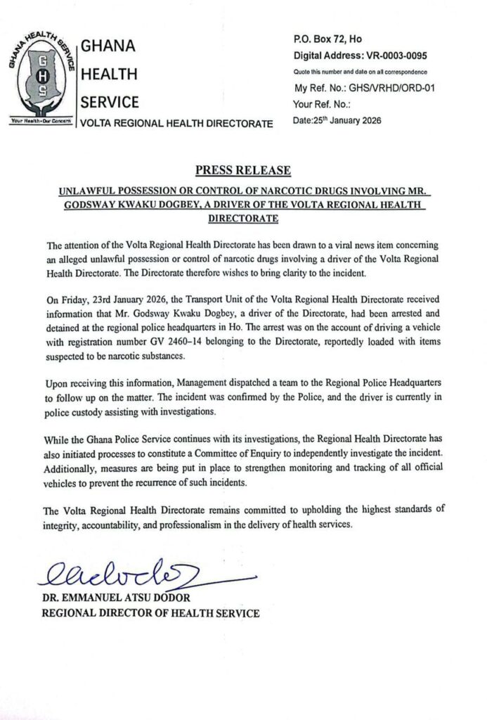 Godsway Kwaku Dogbey, who drives for the VRHD, was taken into custody on Friday, January 23, 2026, after authorities discovered suspected narcotics in a vehicle registered to the Directorate (GV 2460-14).